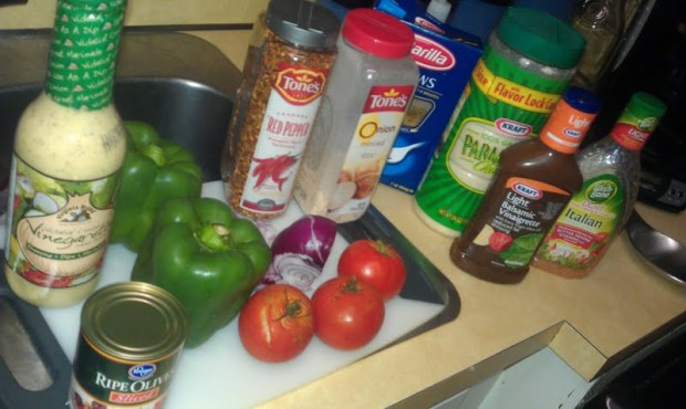 First, I like to pull all of my ingredients together.  I decided I wanted to make 2 completely different types of pasta salad.  One, a new recipe with Josh’s favorite dressing and the other a classic recipe with a twist.  This Vidalia Onion dressing can be found at Sam’s club. I really don’t know where else to find this exact kind but it’s the best. As I was boiling 2 different types of pasta, I decided to cook brown rice to make a stir fry with the fresh snap peas I just got from a co-worker.  Since these recipes are SO EASY, I figured I would share: