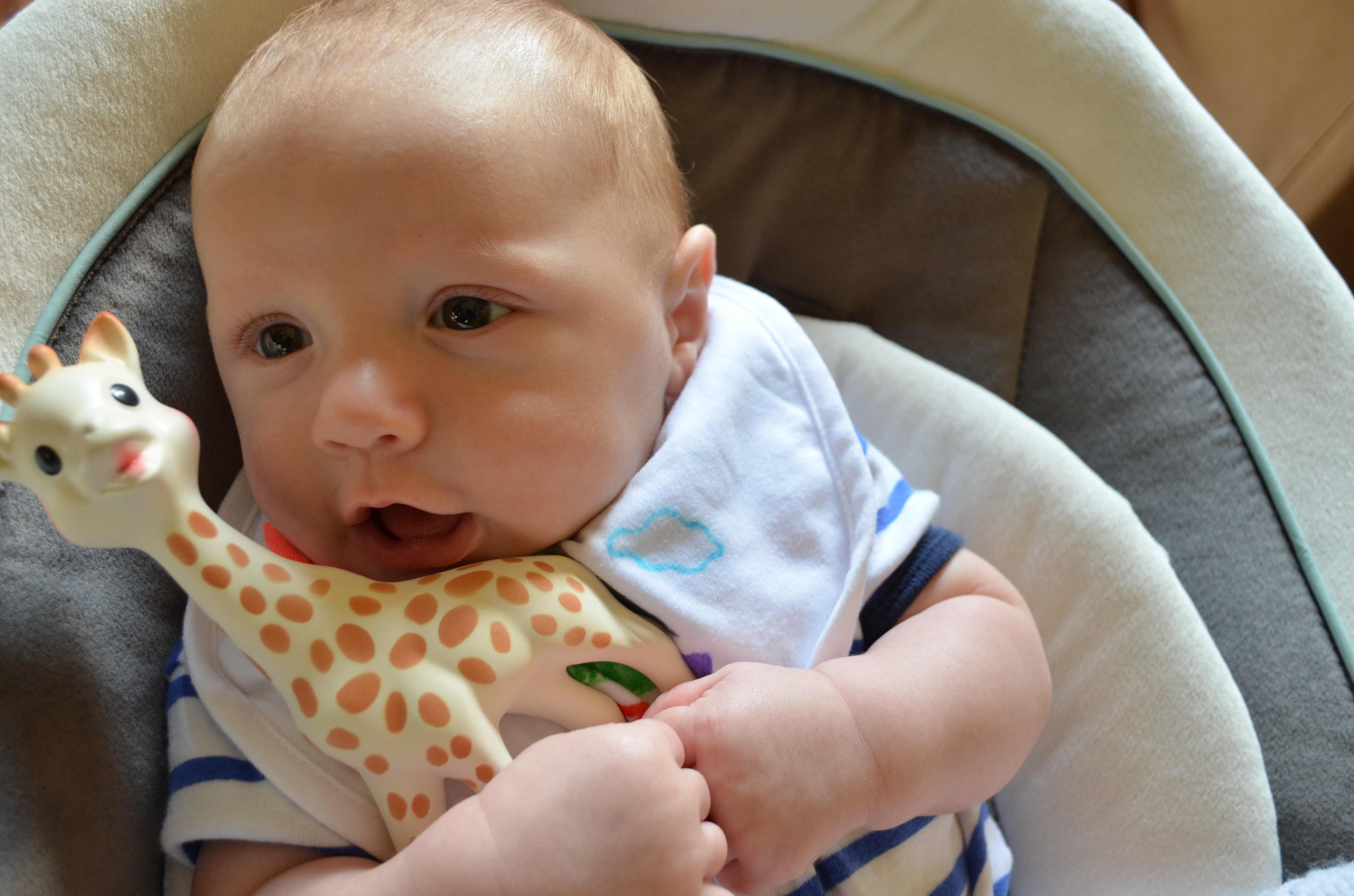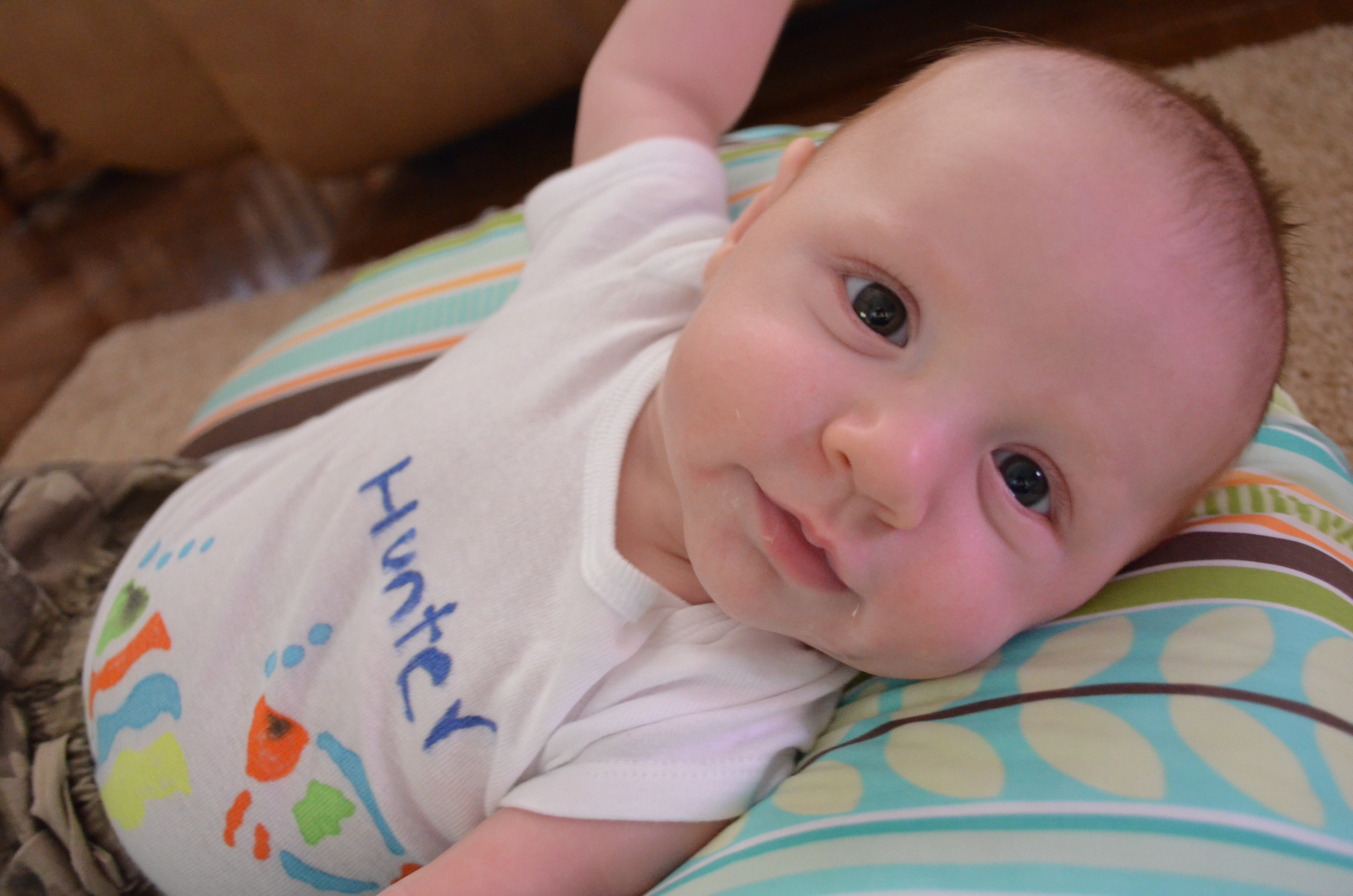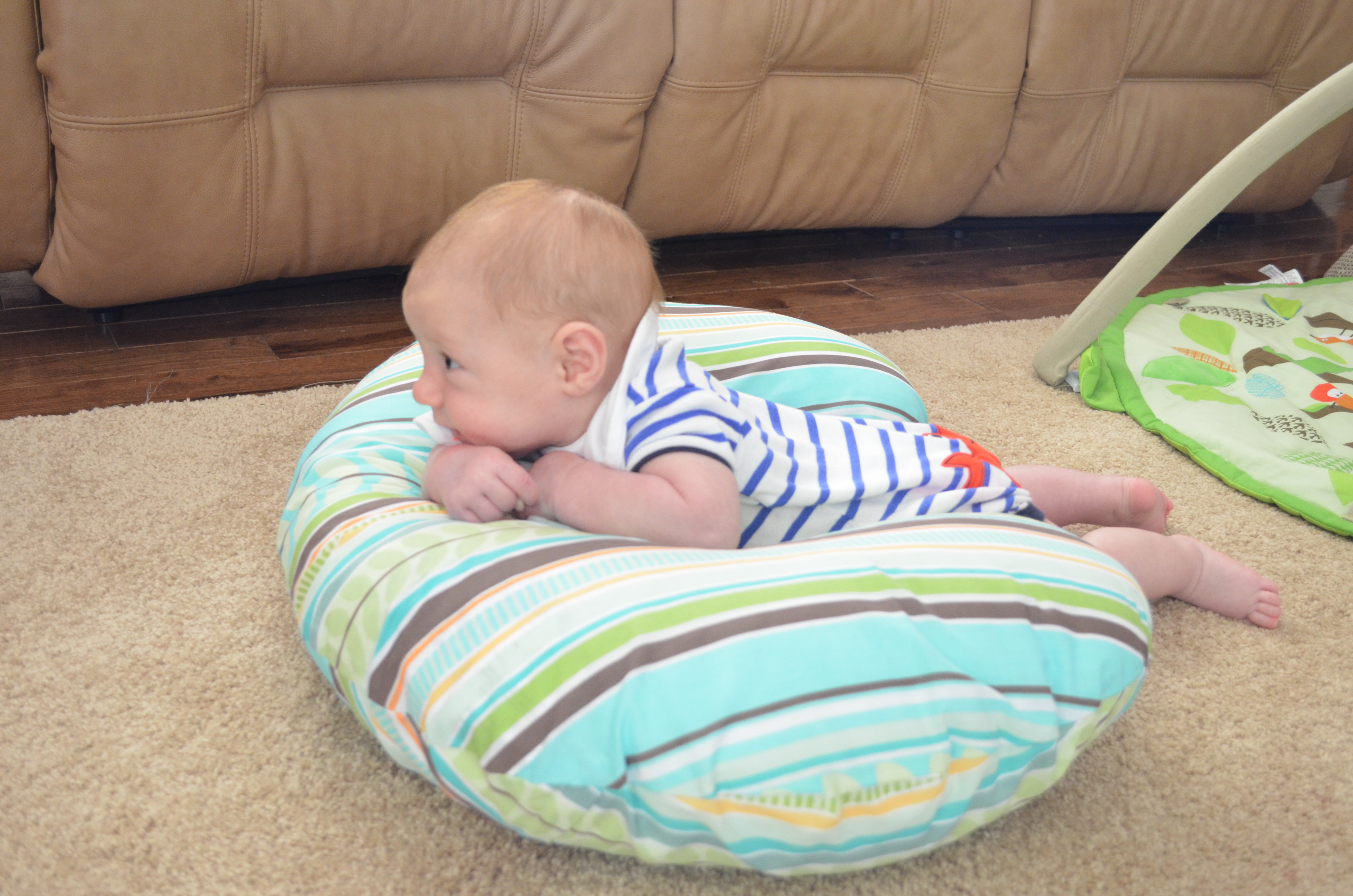 And so now it has been 3 months, 14 weeks actually and our little man is really coming to life. It feels great, as a parent, for him to be out of the infant/ newborn stage. He seems less fragile and he actually does things now, which is so rewarding. He grabs my hair, touches my face, likes to sit up on the couch by himself (fully supported of course), he watches TV and can see the doggies playing. Hunter still loves his owls very much in his activity gym. Just recently I got him those plastic colorful rings that hook together, they are a big hit too.