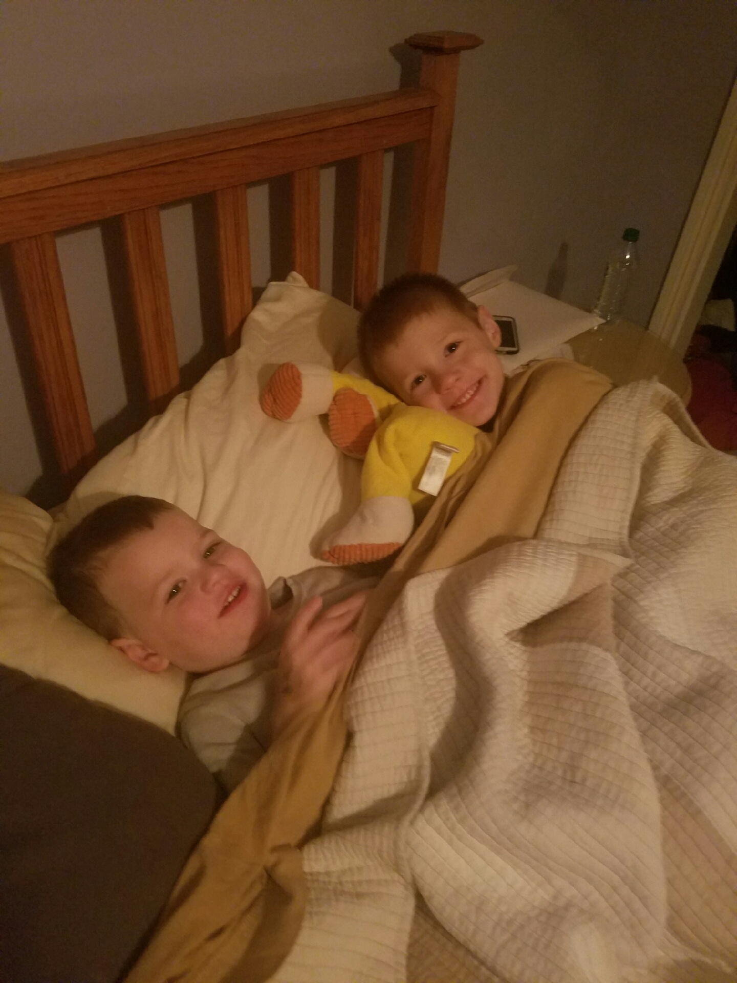 While I left early Thursday and am returning late Friday night, I got the sweetest photo sent to me of my boys at home last night who were scared of the storms at 2 AM. You can see how proud they were to be sleeping in my spot!