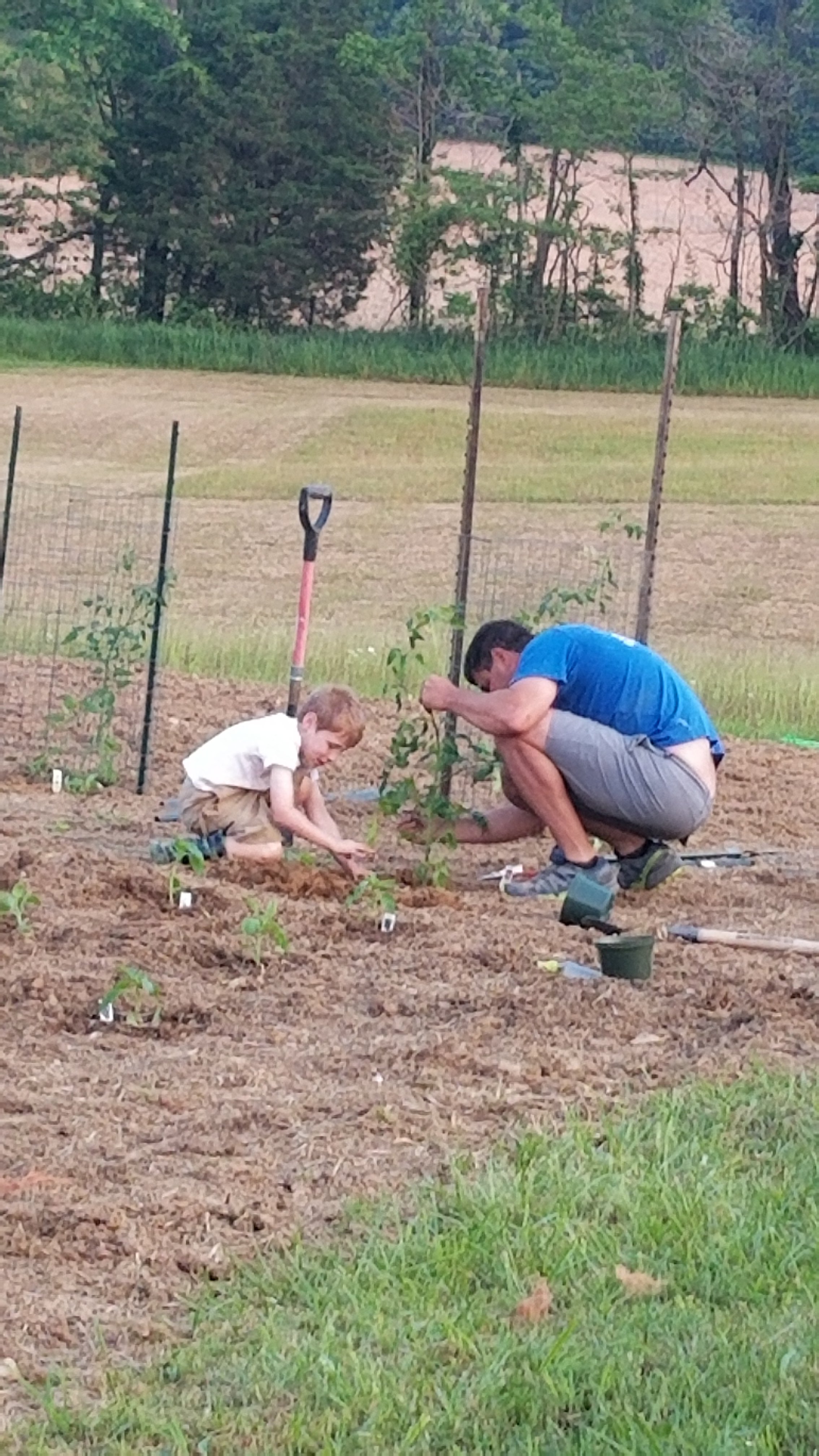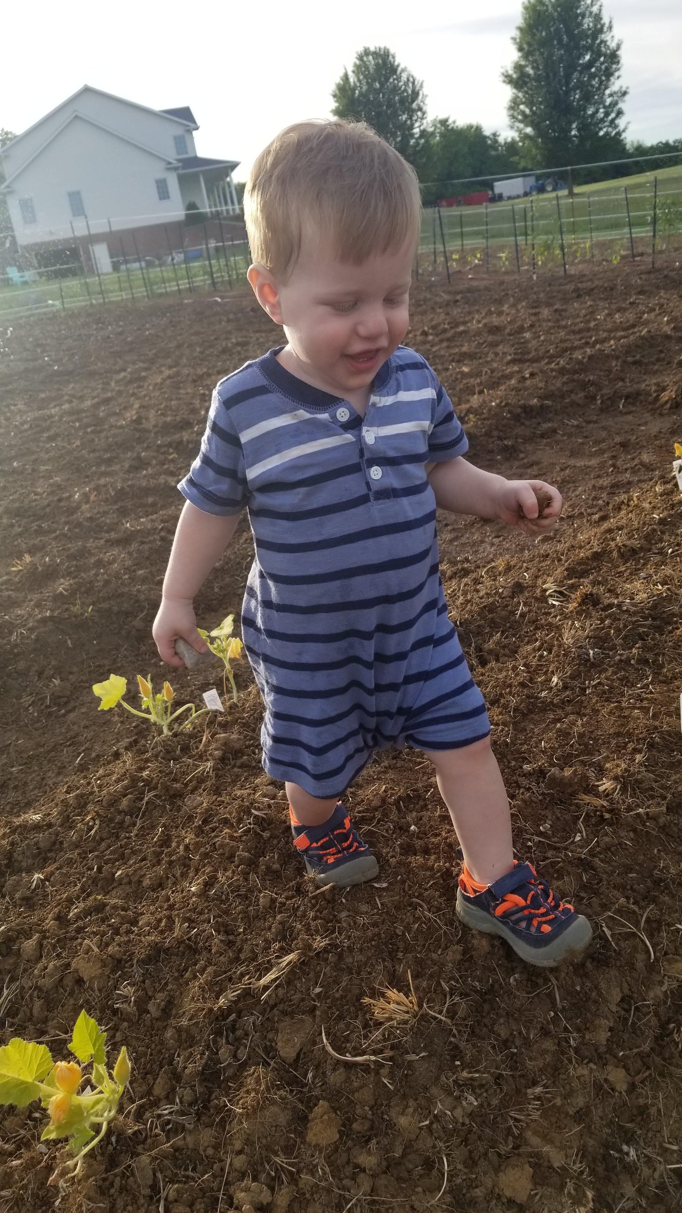 In addition to the seeds, we planted 20 tomato plants, 10 cherry and 10 of other varieties including Big Beef, Yellow tomatoes and Supersonic. We planted many varieties of peppers, 67 individual plants in total ranging from sweet to hot and include peppers such as hot banana, tobasco, jalapeno to purple peppers, sweet red, green bell and even sweet yellow. Josh also found habanero, cayenne, and finally the Carolina Reaper which the boys aren’t even allowed to touch because it is the hottest of them all. My in-laws came and joined in on the fun to help us plant and water as well. Alongside the peppers are 2 rows of strawberries. To be honest, they are not looking so great at this point but we hope they get plenty of water and liven up. Josh learned that we should pick off all berries from the original plants that we planted into the ground so that the strawberry plant can concentrate on growing rather than producing berries. Once it grows large enough, then it can produce the berries again. So fascinating.