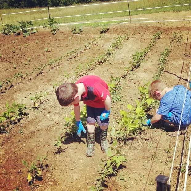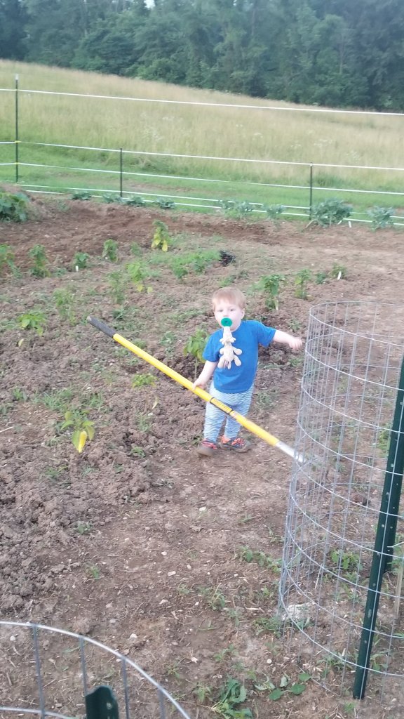 Also, we put the boys to work. The older ones spent a few hours on a Saturday afternoon with us weeding. This has become one of their chores. Wyatt enjoys walking around with the garden tools, sometimes stealing some cherry tomatoes or smacking peppers off the plants with a shovel.