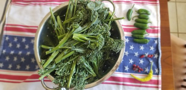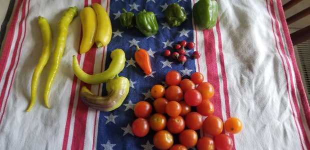 On the 4th of July, we pulled our first little crop from the garden- a variety of peppers (jalapeno, bell, cayenne, habanero and banana peppers) as well as some tomatoes.