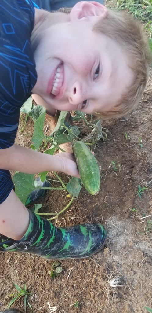 So much has happened in our garden this month. We started the month off with small plants and little fruit or veggies. We are now ending our days picking a few things at a time and bringing them to our kitchen to eat. The boys are enjoying watching their veggies grow and constantly keep an eye on their watermelon and pumpkins! Josh waters with the 2 tri-pod sprinklers every or every other night depending on the rain. This can take 4 hours at a time and occasionally over night. Yes, our water bill had doubled and then some, running 2 different hoses from the house to the garden.