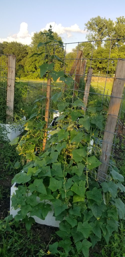 Anyway, with the extreme heat, plants have been slow to grow but we are certainly getting there. We water the garden with two larger sprinklers that shoot out in a large circle. Some times we have to run them overnight! We can bring in a basket full of cucumbers, tomatoes, some peppers, squash and green beans every few days now. The pumpkins and watermelon are far from maturing. And the okra still have a long way to go too.