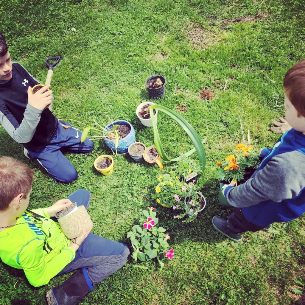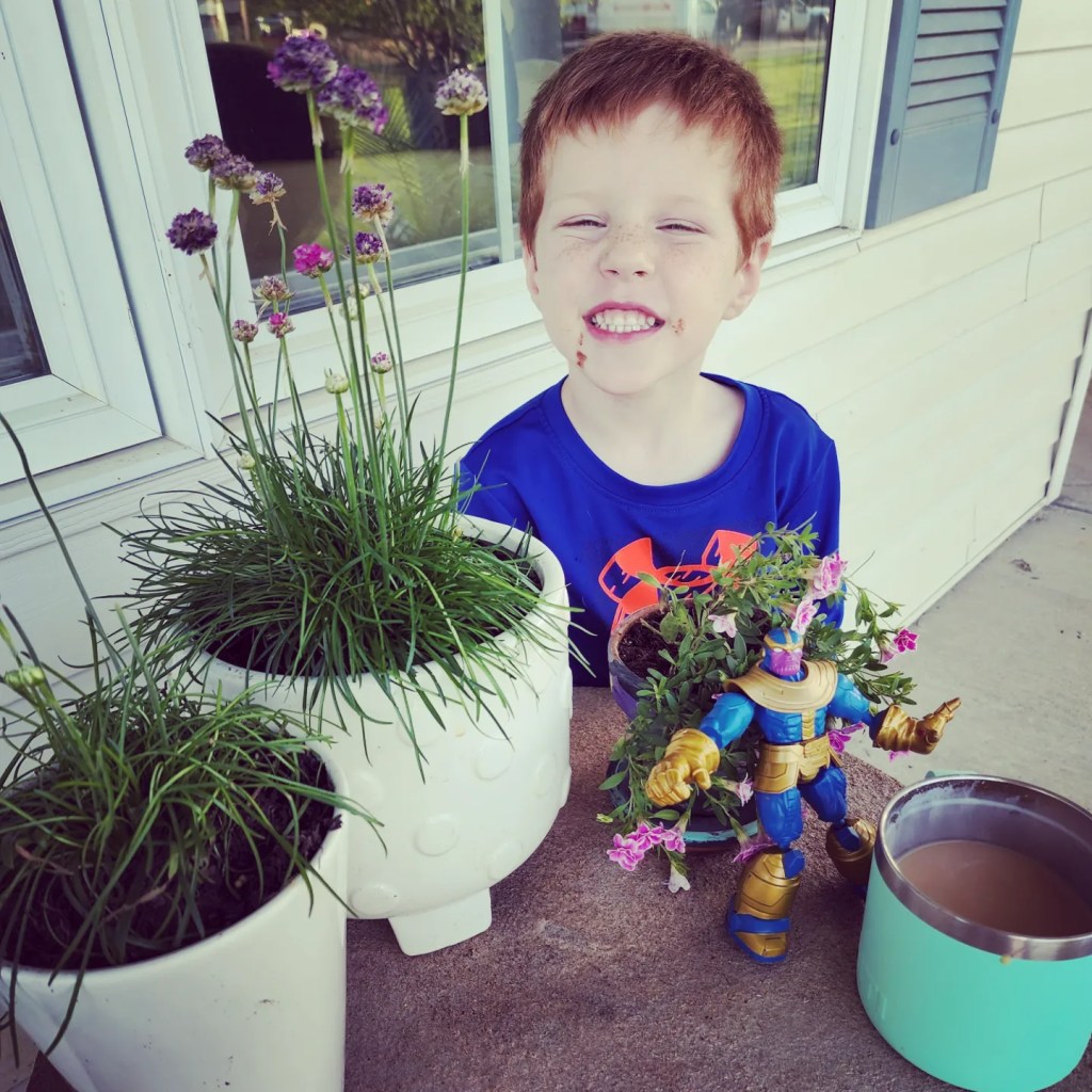 Even though I was regretting all of my life choices when I brought them to Lowe’s (solo!) this weekend, in the end they did a good job choosing colorful flowers. Per tradition, I let them each choose at least one on their own spring flowers that they liked. We bought a bag of fresh soil, they unloaded the flowers with their red wagon, potted and planted and watered. They were all great helpers, I hardly had to do a thing! It was 70 degrees and sunny and we worked in the grass and sunshine. I am glad to wave the wintertime away and embrace almost summer weather.