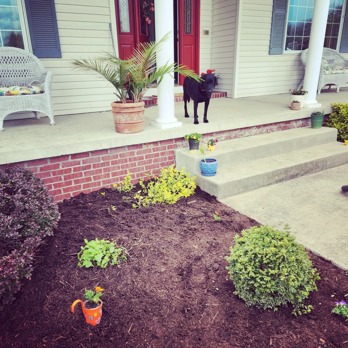 So, this weekend, we chose flowers and added a few to the front landscaping too. Josh refreshed the mulch and added a new boxwood recently. Wyatt picked out orange marigolds. Hunter chose large potted Dahlias and Deacon potted muti colored petunias.