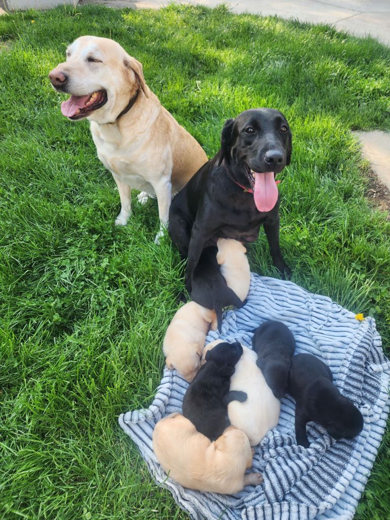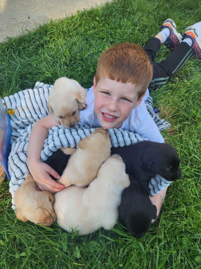 Happy 1st birthday to this first (and only) litter from our labs Remi and Gracie. The boys, Josh and I loved taking care of these puppies and the boys learned lots of life lessons along the way. The boys learned many science lessons and even about the birds and the bees. Introducing these lessons to our boys with dogs as an example makes the conversation much easier! They learned how their Mama, Gracie cared for them, feds them milk and even bathed them and cleaned up for them. The boys saw them as tiny fuzzy pups that could fit in my hand and couldn’t see, hear or walk and then grow right before our very eyes. As they got big enough, we bathed them and took them on walks around the yard. They also made sure to take extra care of Gracie and show her love as she was such a great mom to those pups.
