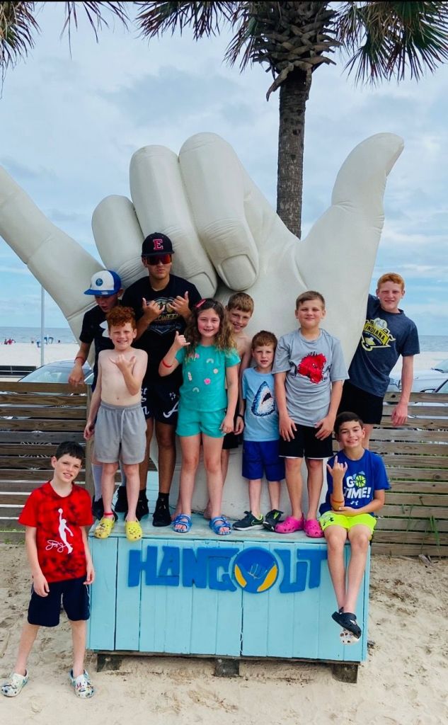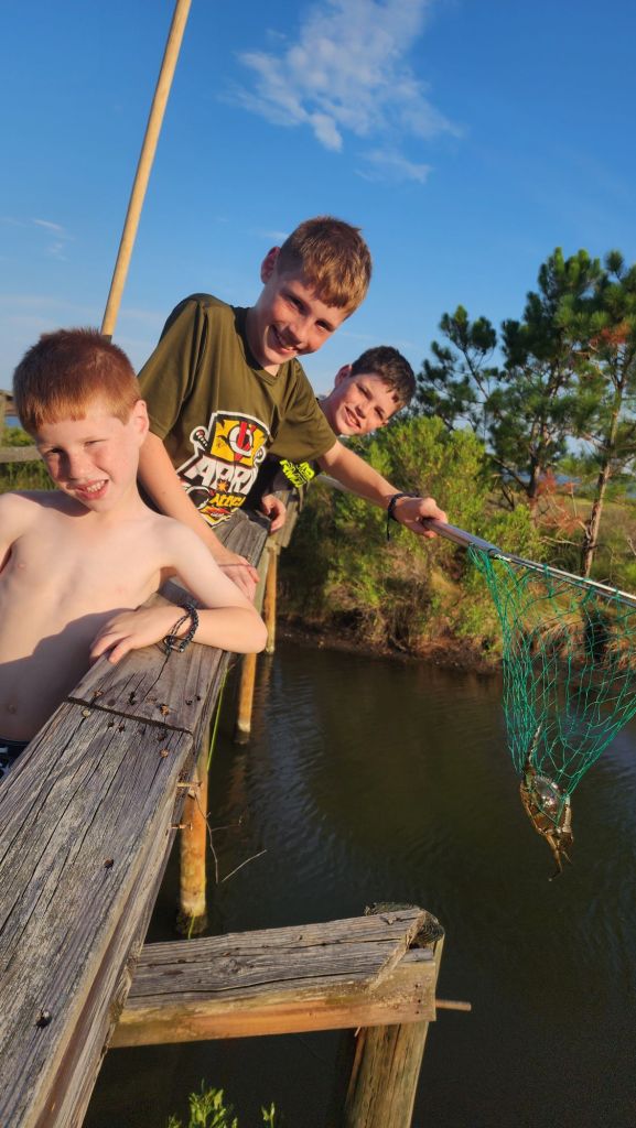 We went to the beach as a family for our first weekend together. They boys fished and we saw a Pirate ship pass by. We then met up with good friends of ours who were all in town for a baseball tournament. We went out to eat, Party of 16 with 10 kids (9 are boys!) and 6 parents. 😁 Friends came to visit and see our new house and how we are getting settled here in Gulf Shores. They even caught crabs, fished and swam from our dock. Josh took the boys to watch their 14U baseball games that week, too, while I worked. We also spent some evenings at their condo nearby, with the boys all swimming and hanging out together until late.